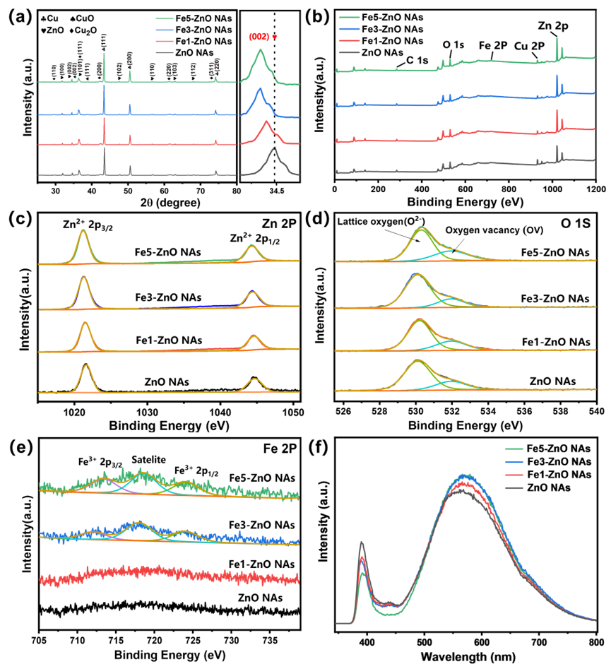 图 4. ZnO NAs和 Fe-ZnO NAs的 XRD 图谱、XPS 光谱和 PL 光谱表征。(a)ZnO NAs、Fe1-ZnO NAs、Fe3-ZnO NAs和 Fe5-ZnO NAs的 XRD 图谱,图中插图为 ZnO NAs和 Fe-ZnO NAs在 34.5°处的 XRD 峰位移情况,(b)XPS 全谱,(c)Zn 2p 核级 XPS 光谱,(d)O 1S 核级 XPS 光谱,(e)Fe 2P 核级 XPS 光谱,(f)ZnO NAs、Fe1-ZnO NAs、Fe3-ZnO NAs和 Fe5-ZnO NAs的 PL 图谱。