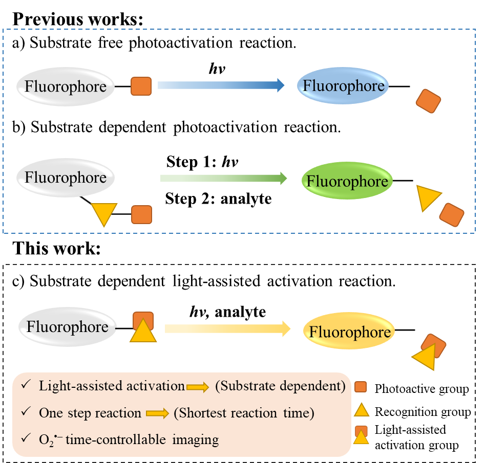光激活荧光探针是监测亚细胞结构的有力工具。然而,由于反应时间长和特异性差等缺点,它们在生物组织中的应用仍然有限。因此,急需设计出一种响应快速、生物组织伤害低且具有识别底物的光激活探针用于生物组织的定时可控成像。