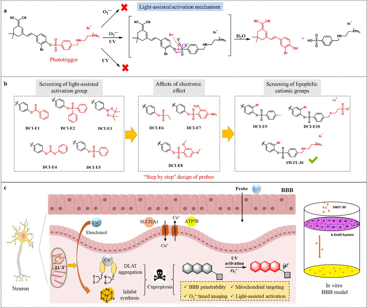 在这项工作中,作者开发了一种基于磺酸酯识别基团的新型光辅助激活荧光探针。该探针仅在紫外线(UV)和超氧阴离子(O2•‒)同时存在时才会产生荧光信号。这种双重识别机制确保了荧光信号的精确可控性,同时保持了高特异性和最快的反应动力学(<30 s)。基于这一设计,构建了一种线粒体靶向和血脑屏障穿透探针(SWJT-30),用于时间可控地检测脑缺血再灌注损伤(CIRI)中的活性氧波动。通过这项研究,作者不仅阐明了铜死亡在CIRI中的作用,还证明了光辅助激活探针在不同病理和生理背景下进行时空控制成像的广泛潜力。